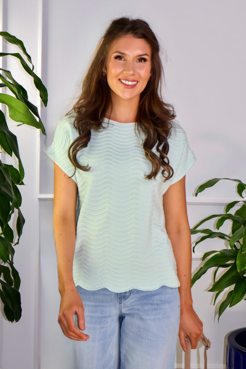 Kaylani Fine Gauge Scallop Pattern Knit Top : Light Aqua