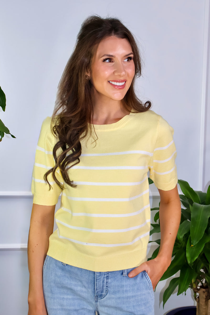 Elaina Soft Fine Gauge Short Sleeve Striped Top : Yellow