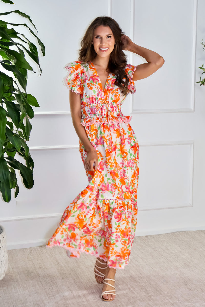 Camila Lace Trim Detail V-Neckline Maxi Dress : Cream Multi