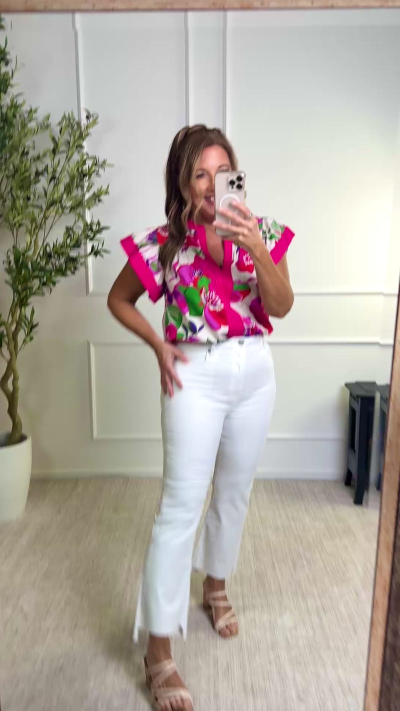 Analia Flutter Sleeve Floral Print V-Neck Top : Cream Multi