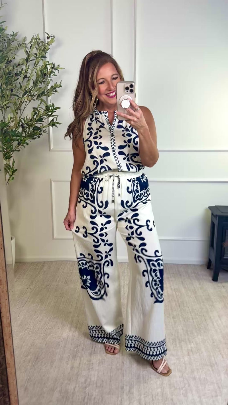 Ariah Border Wide Leg Elastic Waist Pants : Ivory/Navy
