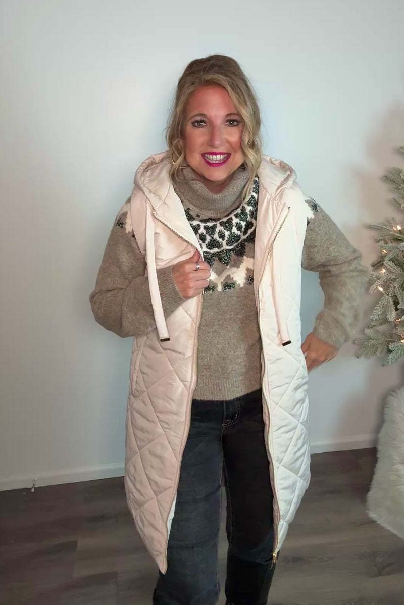 Devora Quilted Puffer Long Hoodie Vest : Ivory