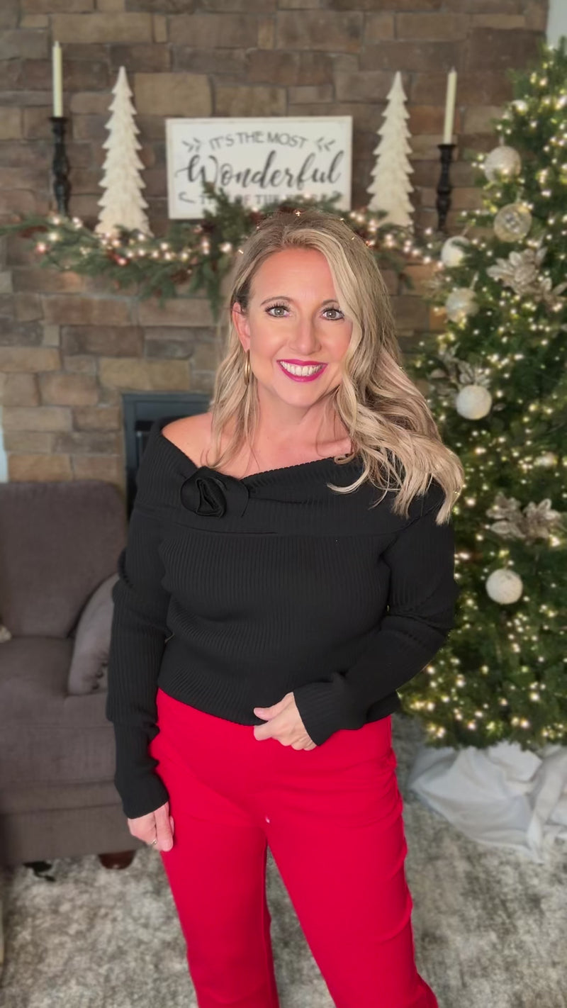 Estella Rose Corsage Off Shoulder Rib Knitted Sweater : Black