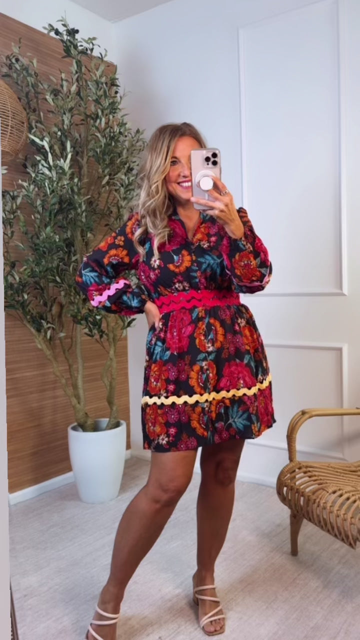 Kailani Floral Trimmed Split Neckline Dress : Black Multi