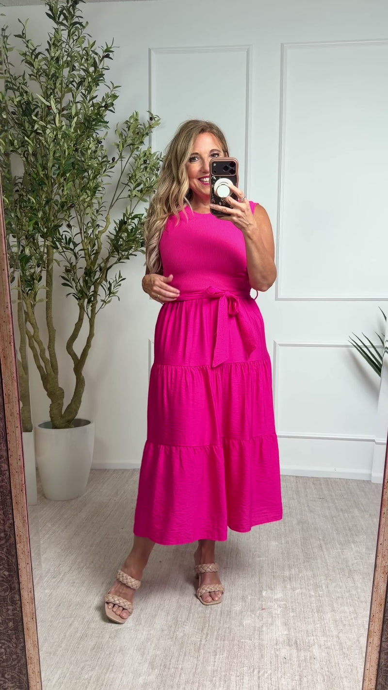 Kaitlyn Rib Knit Contrast Tiered Midi Dress : Pink