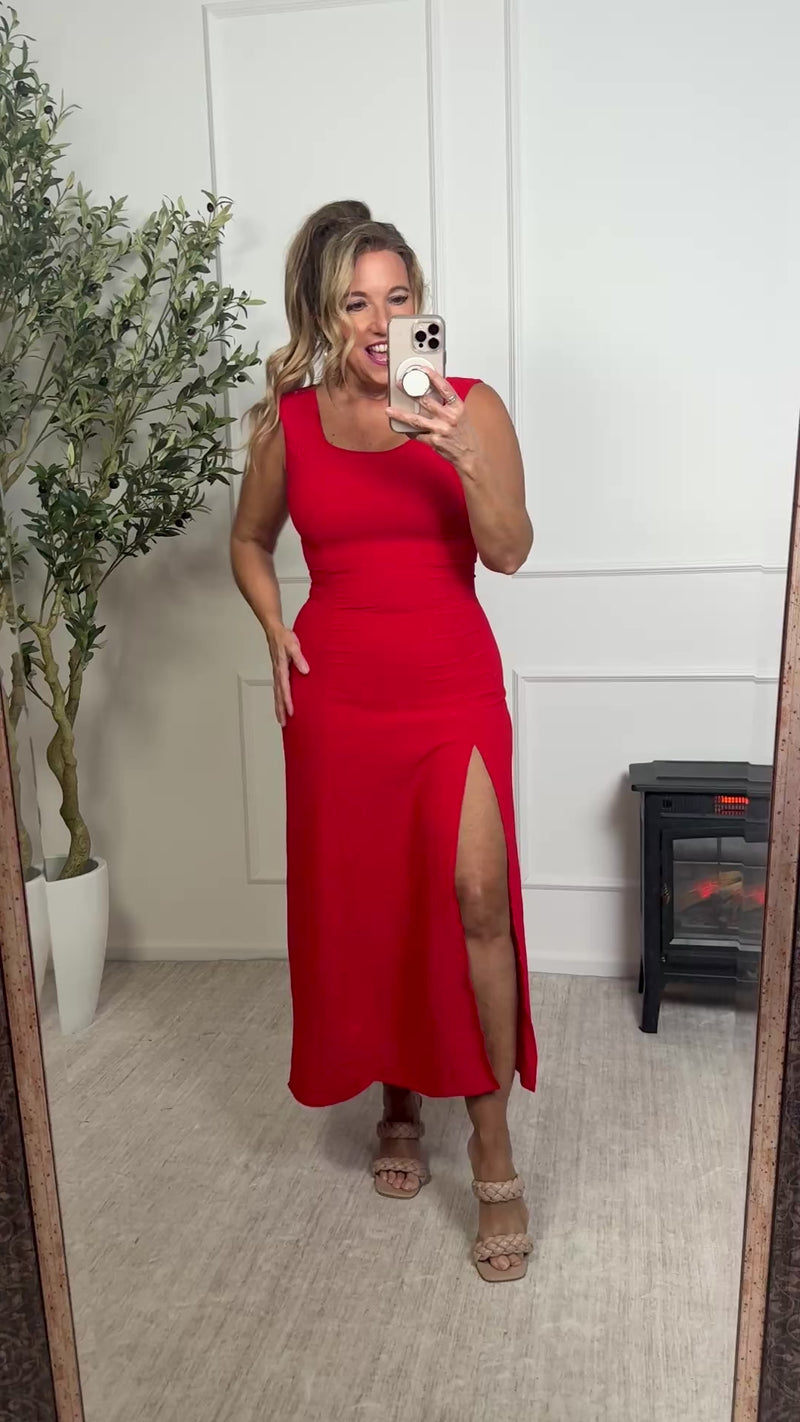 Kensley Cap Sleeve Scoop Neck High Slit Maxi Dress : Red