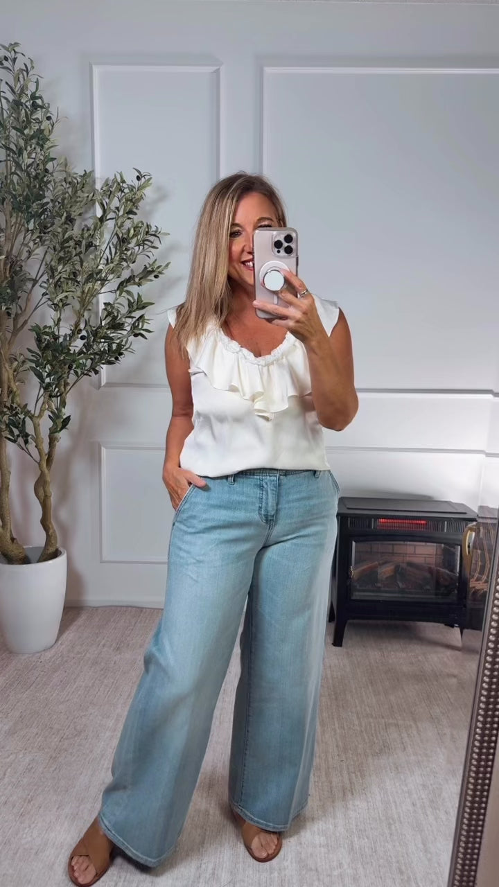Liverpool Mariam Ruffle Front Sleeveless Woven Knit Top : Cream