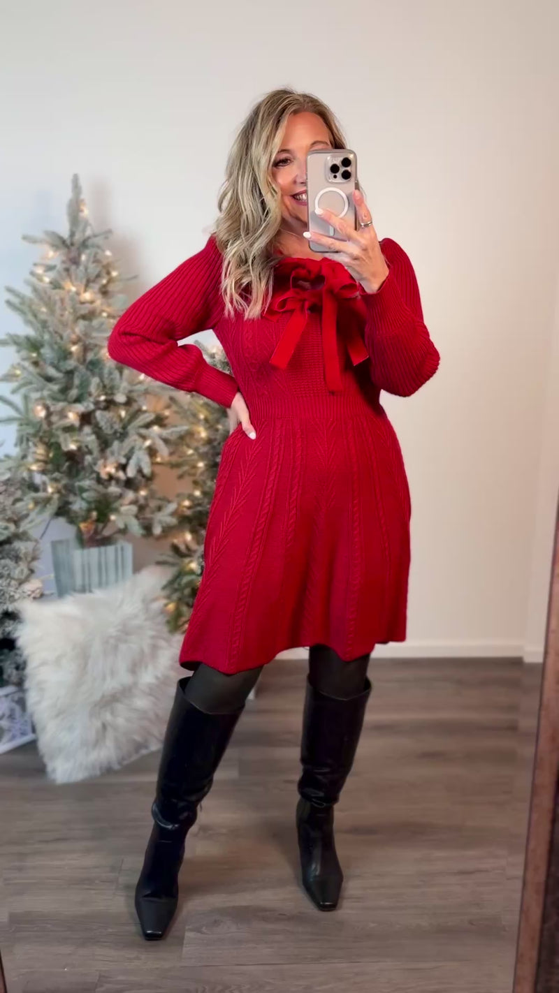 Petunia Velvet Bow Cable Sweater Mini Dress : Dark Red