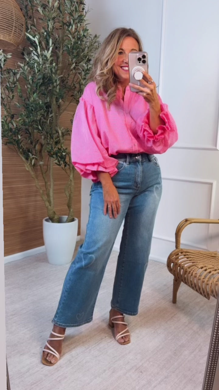Zaya Pinstripe Bubble Sleeve Blouse : Pink